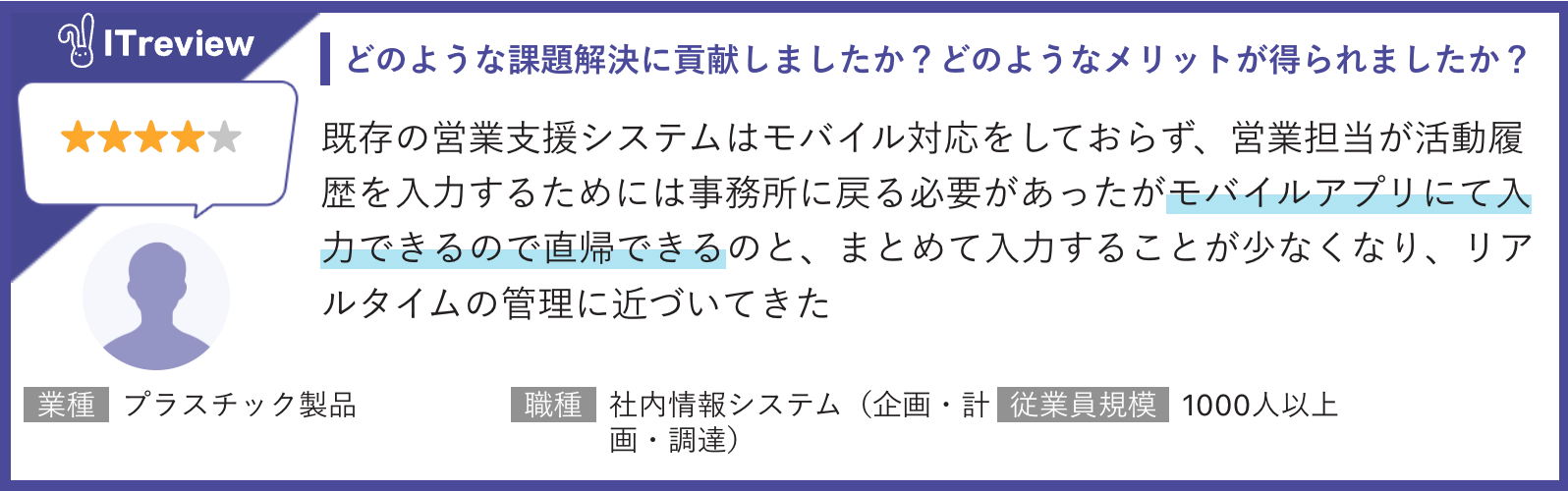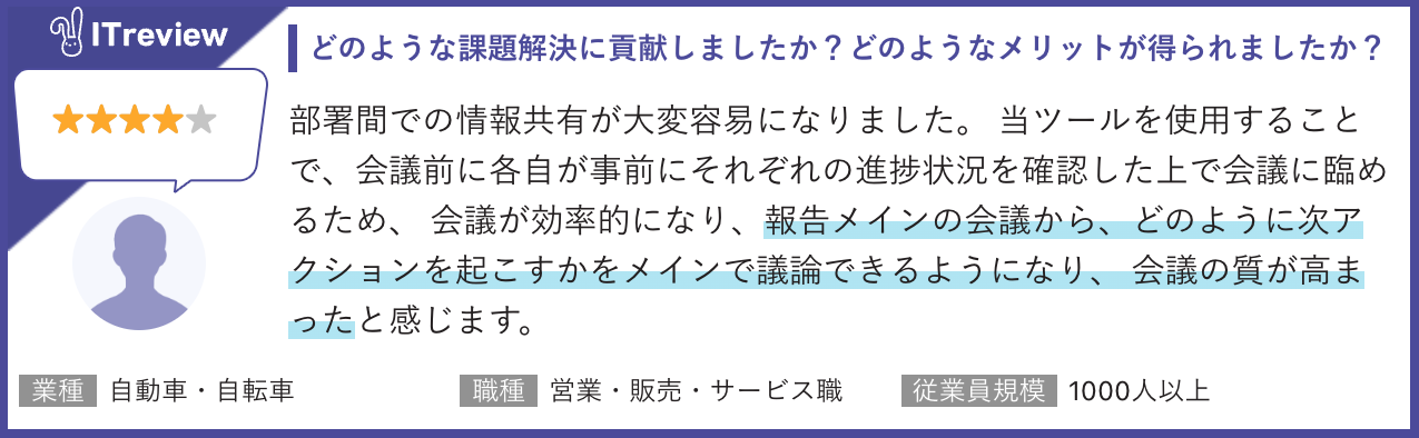 今回の「ITreview Grid Award 2025 Fall」は2025年9月までに掲載されたレビューの集計結果をもとに選定されています。「GENIEE SFA/CRM」を活用した営業進捗の可視化による社内での情報共有や会議の質の改善に関する高評価のコメントが多く寄せられました。また、モバイルアプリで外出先から入力できる点も評価されました。