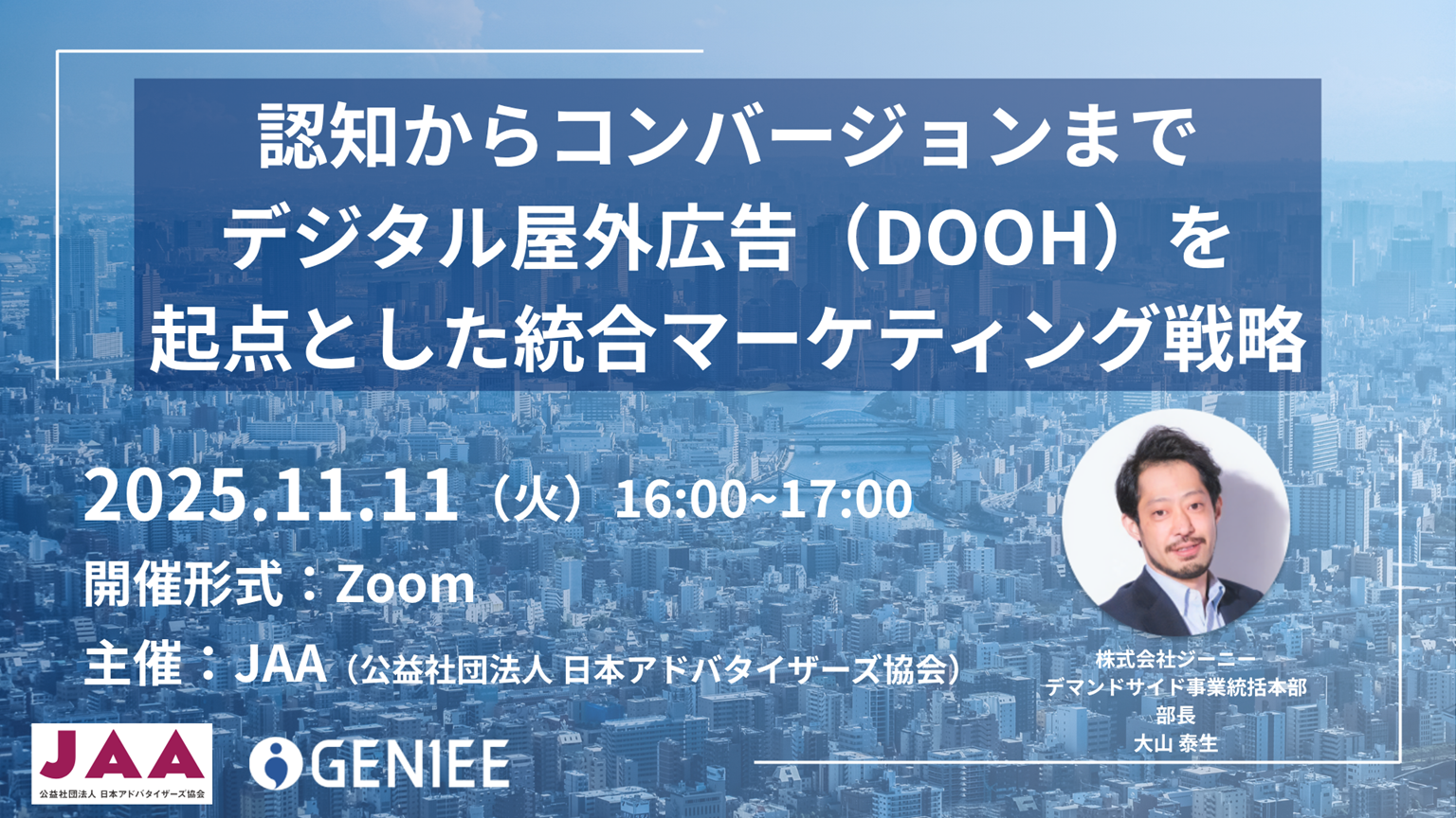 株式会社ジーニー デマンドサイド事業統括本部は、2025年11月11日(火)に開催されるオンラインセミナー「認知からコンバージョンまで デジタル屋外広告(DOOH)を起点とした統合マーケティング戦略」(主催:公益社団法人 日本アドバタイザーズ協会)に登壇します。